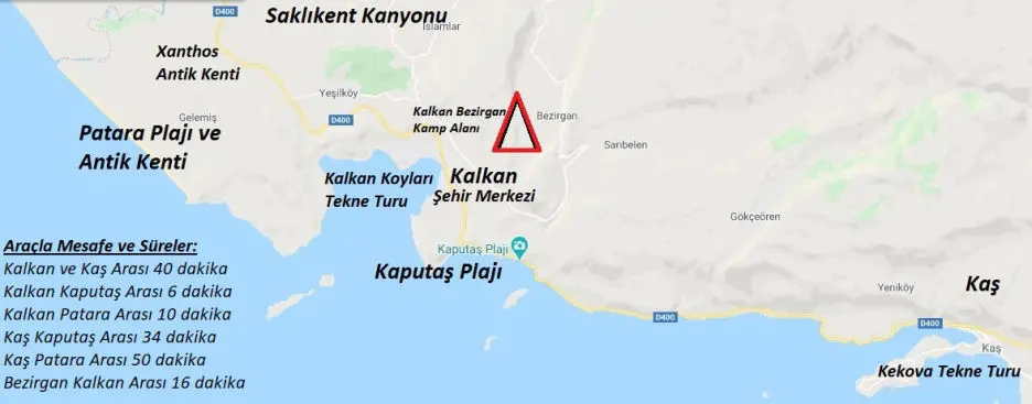 Kamp alanı Kalkan Merkeze 16 dakika, Fethiye'ye 1 saat 20 dakika, Kaş'a 40 dakika sürüş mesafesindedir.